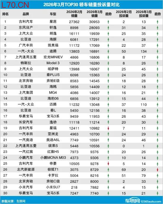 据行业综合销量数据显示,2026年3月国内轿车市场累计零售销量67.6万辆,环比上涨59.8%,同比下降25.1%。同期老股民经验,车质网受理车主针对轿车的有效投诉11,403宗,环比大涨73.7%,同比下降9.7%。去除投诉人自愿申请撤诉的信息后,2026年3月TOP30轿车销量投诉量排名如下:
