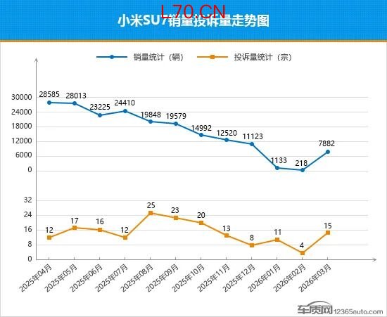 或许在很多人印象中,小米SU7还是那个全新车型,但事实上它已经上市2年有余,也算是一名“老将”了。从其近一年的销量走势可以看到,自2025年4月起,受产品竞争力下降与YU7上市影响,小米SU7销量整体进入阶段性下行区间。2026年3月,伴随着新一代车型上市交付,其月销量迎来大幅反弹,虽暂未突破万辆关口,但已向市场传递出强劲的复苏信号。据小米官方数据,新一代SU7自3月23日启动交付以来,9天的交付量已经超过7000台,交付效率与市场热度表现亮眼。相比于销量的回暖,小米SU7的投诉量也有所抬头,3月的投诉量增长至两位数,口碑变化需引起企业高度重视。从投诉销量比层面来看,本月小米SU7的数值较2月大幅降低,整体进步显著。随着产能稳步释放与换代车型的产品力加持,小米SU7市场表现有望持续走强,重回月销万辆梯队值得期待。