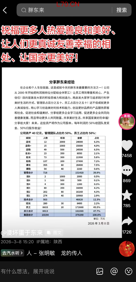于东来:胖东来从2000年开始把利润按岗位分配给全体职工