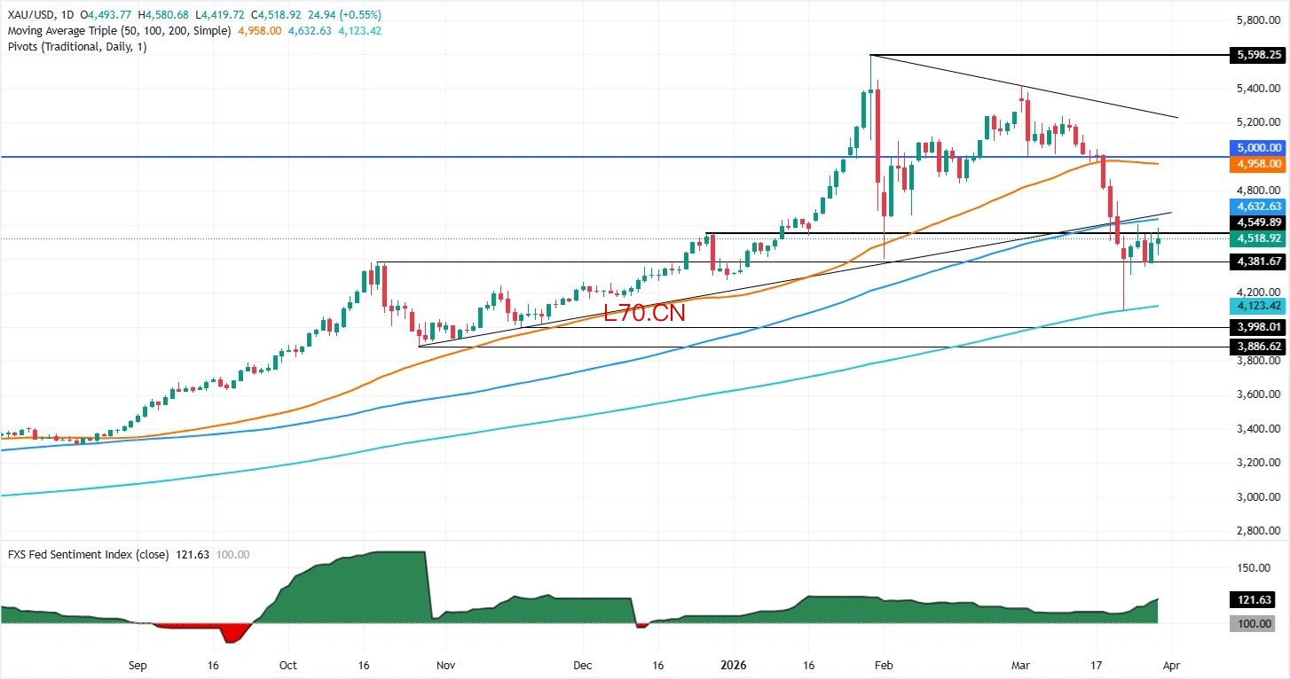 Valencia补充道,相反,如果金价重挫至4500美元/盎司下方,首个支撑位将是2月2日的波段低点4402美元/盎司,其后是3月24日的日低4305美元/盎司,再下方则是200日SMA 4100美元/盎司。