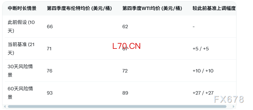 回答:上调5美元反映中断延长带来的库存加速下降和地缘溢价持续。高盛预计在基准恢复路径下,国际能源署4亿桶储备释放将部分缓冲,但无法完全抵消缺口,导致Q4价格较此前66/62美元更高。若市场确信中断不会长期化,油价上涨趋势将维持,直至三月流量数据改善。