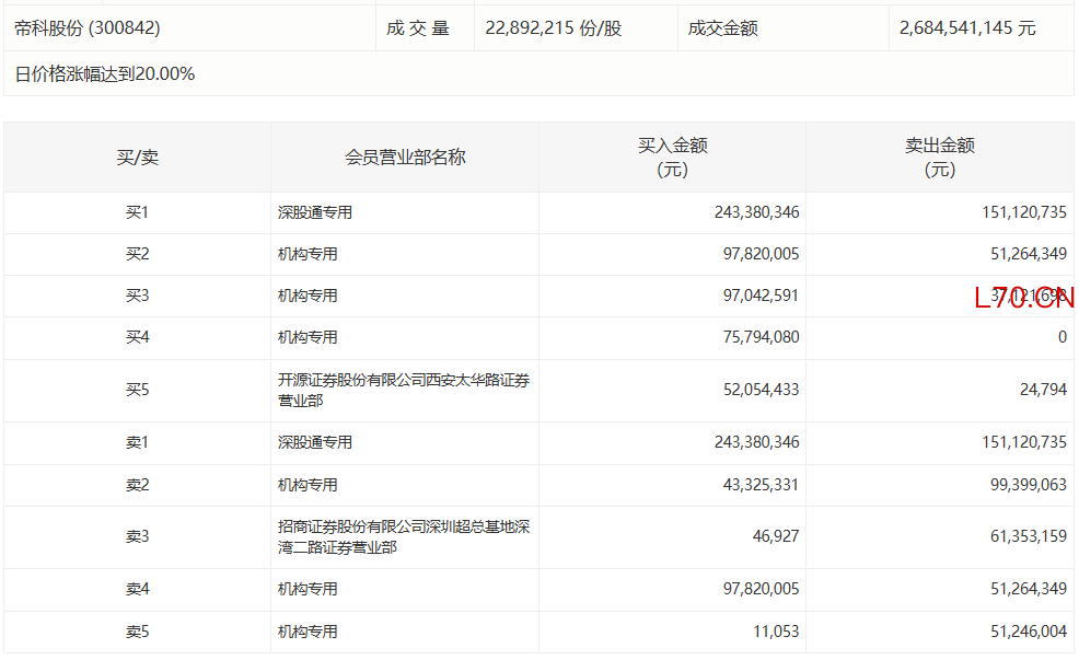 帝科股份今日20cm涨停,3家机构专用席位净买入1.82亿元