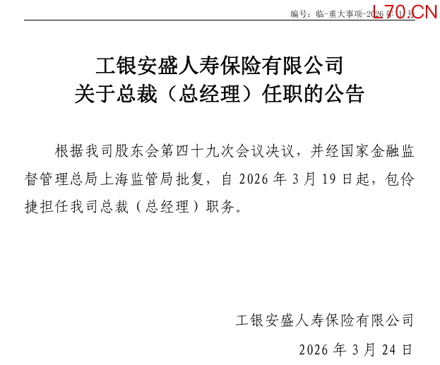 元股证券:ygzq.hk机构之家注意到,3月24日,工银安盛人寿保险有限公司(以下简称“工银安盛人寿”)发布总裁任职公告:根据公司股东会第四十九次会议决议,并经国家金融监督管理总局上海监管局批复,自2026年3月19日起,包伶捷担任公司总裁(总经理)职务。