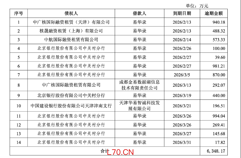 易华录4月2日晚间公告,经公司相关部门统计核实,截至公告日,公司累计未能清偿到期债务合计6348.17万元,占公司2024年度经审计净资产的8.71%。