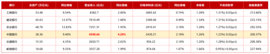 2025年年报显示,中行资产规模较上年末增长9.4%至38.36万亿,报告期内实现营业收入6598.66亿元、同比增长4.28%,增速在六大行中排名第一,归母净利润2430.21亿元,同比增长2.18%;营利能力稳步提升的同时,中行进一步巩固资产质量,不良率仅1.23%,为五大行最低水平,同时较金融监管总局披露同期末行业均值1.5%低出27bp。