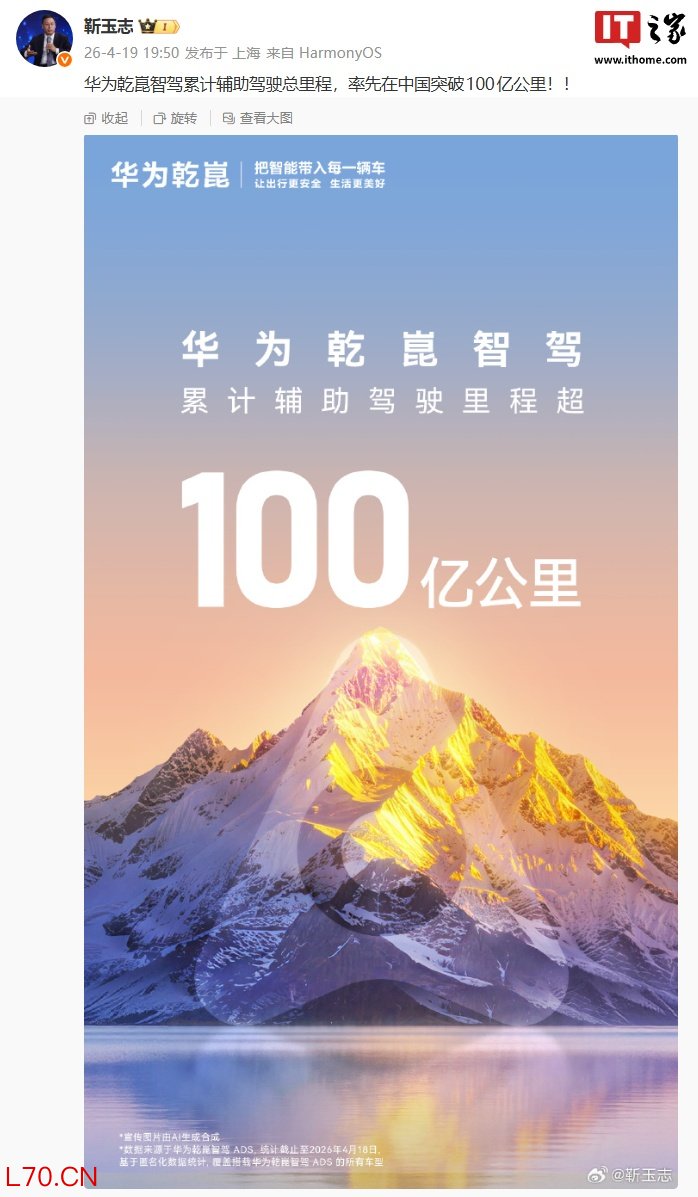 华为靳玉志:乾崑智驾累计辅助驾驶总里程,率先在中国突破 100 亿公里