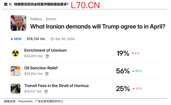 不管是三月下旬的美国15条还是近期的伊朗10条,核心诉求主要集中在三方面:浓缩铀、伊朗制裁豁免与霍尔木兹海峡通行费。根据Polymarket的数据,市场对特朗普在4月与伊朗的谈判中,最有可能让步的是第二项:降低对伊朗的原油制裁,其概率已升至56%。相比之下,浓缩铀问题涉及层面过于复杂,市场普遍认为特朗普几乎不可能让步;霍尔木兹海峡的通行费问题则更为棘手。若美国以任何形式对此予以认可,都将直接提升伊朗在地区乃至全球能源与地缘政治格局中的话语权。