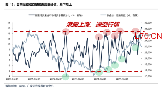 当前做空成交量易下难上:从数据来看,当前做空成交量占比12%左右,已触及较高水平,即便回顾2021年至2022年港股深度调整阶段,当时的做空成交量占比也大致处于这一区间,意味着进一步上行的空间相对有限,做空成交量易下难上。