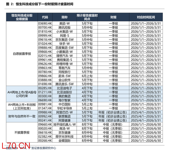 (1)年报披露利空出尽,业绩、回购、分红等不确定性消除:互联网公司及恒生科技主要成分股的年报初步业绩公告普遍集中在3月末披露完毕,年报业绩低于预期、减少回购、增加对AI投入/资本开支等利空表述,市场已经基本消化完毕。下一次的集中披露期可能主要是5月中下旬,部分恒科成分股自愿披露一季报。